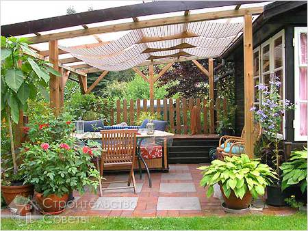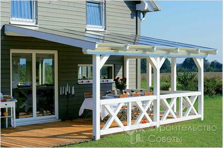 Дачный навес должен быть сделан с учетом ветроустойчивости и снежных нагрузок. Поэтому будьте внимательны, предусматривая угол наклона кровельной конструкции и рассчитывая толщину несущих стоек.