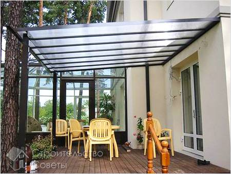 Рассмотрим наиболее популярную конструкцию, которую применяют для того, чтобы сделать навесы – это каркас с кровельным покрытием из поликарбоната. Еще одним плюсом его является то, что он легко монтируется собственноручно и для этого потребуется небольшое количество времени.