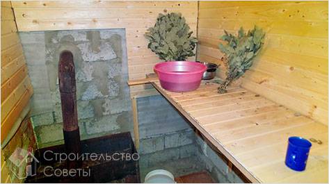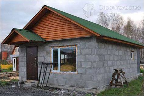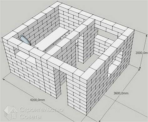 Стены бани можно выкладывать толщиной в половину блока и с внутренней стороны использовать пенополистирол или пенопласт для теплоизоляции. Если эксплуатация бани предполагается только в летнее время, стены возводить из целых блоков шириной в 39 см без применения теплоизоляционных материалов.