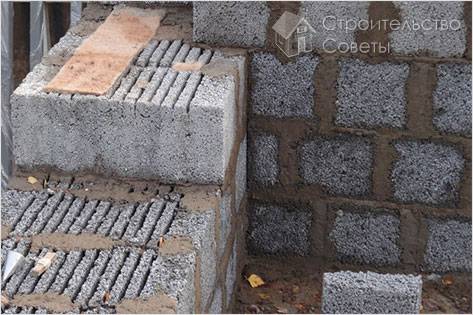 - Работы по укладке керамзитобетонных блоков начинать с угла здания. Для связки блоков использовать цементно-песчаный раствор с добавлением извести. В первом ряду оставить карманы для монтажа балок пола.