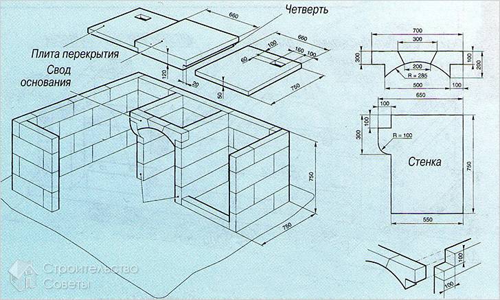 Поскольку универсального чертежа по поводу того, как построить барбекюшницу нет, его можно нарисовать самому или воспользоваться схемами, расположенными в конце статьи.