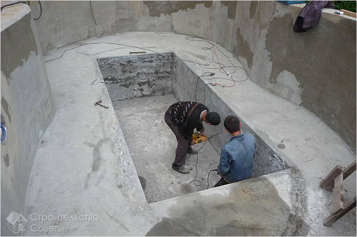 - На этапе подготовки чаши нужно принять решение о том, как будет организована лестница – обыкновенная металлическая, прочно вделанная в бортик и днище, или широкие ступени, сформированные в стене искусственного водоема.