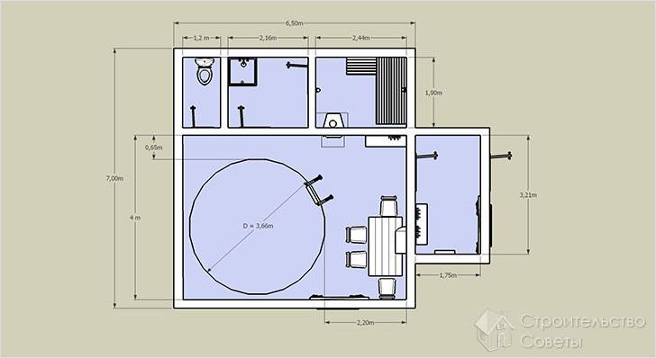 В нем можно разместить каркасный бассейн подходящего размера на весь теплый сезон. На зиму воду сливают, конструкцию складывают, освобождая пространство для любых других целей.