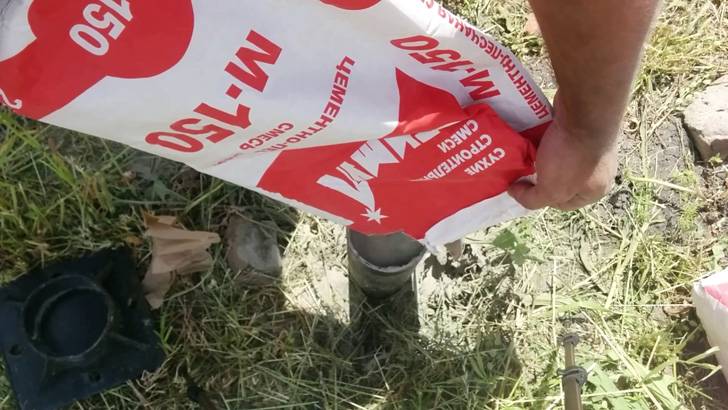 - Плоскость будущей обвязки размечают по нивелиру, отмечают уровень на каждой свае и обрезают ее болгаркой до требуемой высоты. В трубу заливают бетонный раствор, не доливая 10 см до края, и заполняют оставшееся пространство сухой цементно-песчаной смесью.