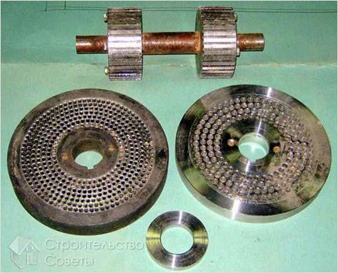 Чтобы не возиться с конструкцией данного оборудования, достаточно приобрести уже готовую матрицу и катки, продающиеся производителями грануляторов для комбикорма. Естественно, не исключен и способ собственноручного их изготовления из листа металла толщиной 20 мм и шестерен, расположенных на валу.