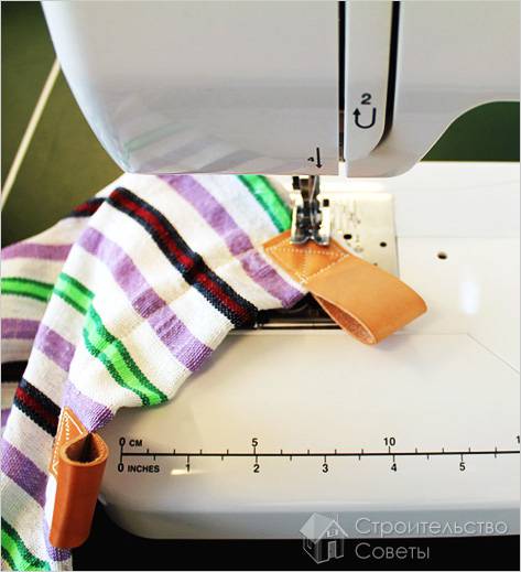 Через готовые петли пропускается шнур. Далее нужно сшить концы шнура между собой. Если машинка не предназначена для шитья заготовок такой толщины, можно вручную скрепить концы между собой с помощью большой иглы или использовать мебельный степлер.