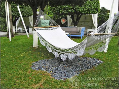 Чтобы самостоятельно повесить гамак, необходимо подготовить два опорных столба и углубить их в землю не менее чем на один метр. Планируя самостоятельно сделать обычный гамак или кресло гамак, следует помнить: чем больше провисание у гамака, тем меньше расчетная нагрузка на опорные элементы.
