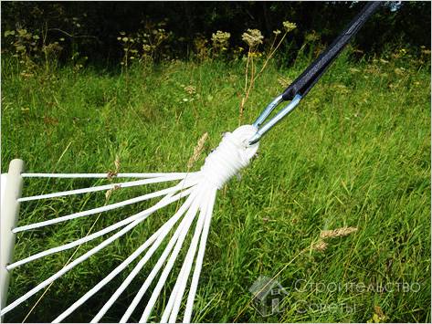 При изготовлении в домашних условиях гамака из шнуров необходимо использовать только хлопчатобумажные нити, в которых не содержится синтетики. На них и узлы затягиваются туже, и соприкосновение с ними приятнее, нежели с изделием из капрона. Для мест, которые будут соприкасаться с опорами или деревом, необходимо использовать капроновый трубчатый хомут.