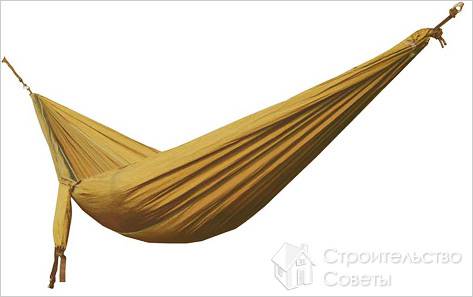 Одноместный гамак можно сделать из цельного куска любой хлопчатобумажной ткани. Если предстоит длительный поход или просто поездка в лес, можно сделать в домашних условиях походный вариант гамака из нейлона. Он станет своеобразным туристическим атрибутом, который не будет занимать много места в рюкзаке или багажнике машины.