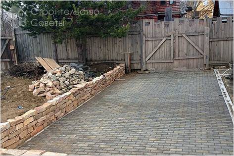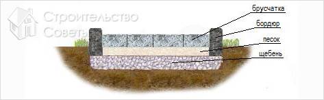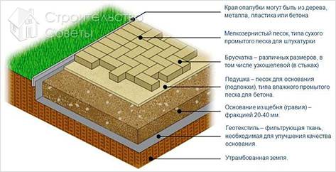 Особенностью обустройства площадок этого типа (в отличие от уже рассмотренных нами вариантов) являются характерные размеры насыпной подушки, подготавливаемой перед тем, как укладывать брусчатку.
