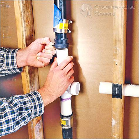 - стык между новой ПВХ трубой и старой чугунной обязательно обработайте герметиком, чтобы предотвратить течь.