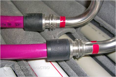 Затем необходимо зачистить образовавшиеся заусенцы, особенно если для распила использовался такой инструмент, как ножовка. На самой трубе необходимо сделать отметки глубины установки фитинга. Далее вам нужно смазать край отрезка специализированным составом, а точнее смазкой для сантехнических работ. С предварительно раскрученного фитинга снимаем гайку для зажима и одеваем ее непосредственно на саму трубу, затем сверху натягиваем упорное резиновое кольцо. В результате проделанной процедуры торцы нагреваются и соединяются под давлением. Сварка очень надежно прикрепляет детали друг к другу. Обратите внимание на температурный режим.