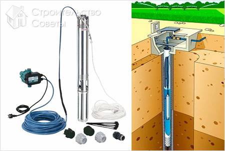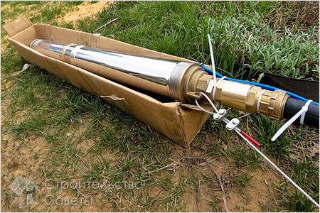 Вместе с насосом опускают в скважину эксплуатационную пластиковую трубу, по которой будет подниматься вода, страховочный трос и электрический кабель для двигателя насоса. Трос закрепляют на оголовке скважины, а защищенный кабель и трубу для подачи воды подводят в дом. Оголовок нужен для герметизации устья конструкции скважины.