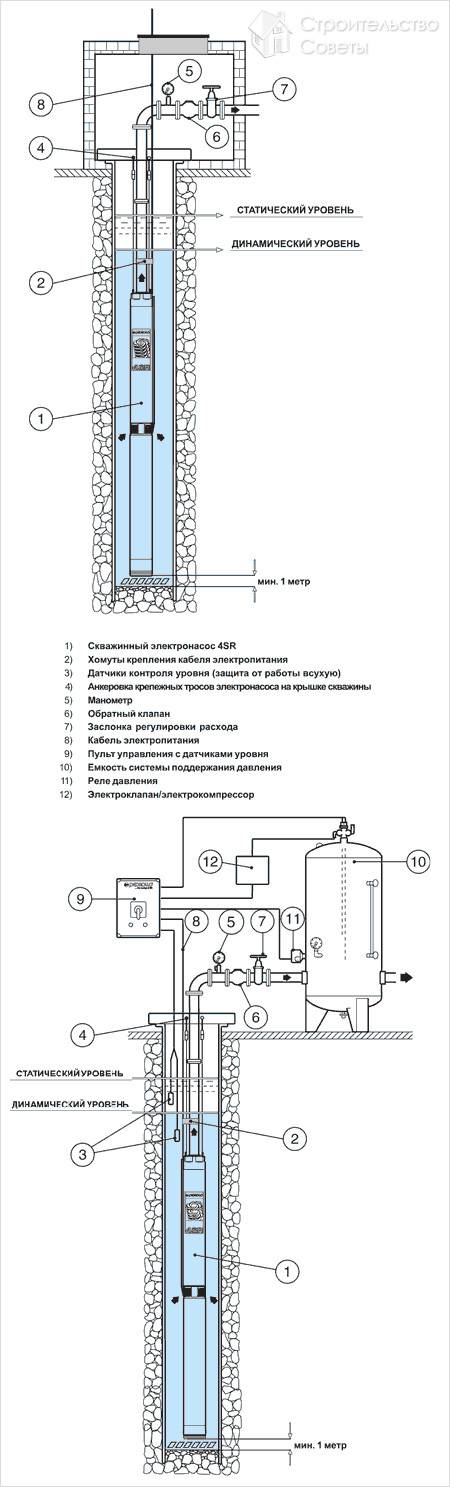 Насос должен устанавливаться в скважину ниже показателя уровня воды, но не ближе одного метра до дна, чтобы при работе оборудования не захватывался песок и осадочный грунт, которые могут с течением времени скапливаться внизу скважины.
