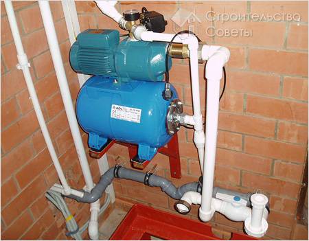 - Обустройство станции водоснабжения. Место монтажа станции снабжения водой водопровода полностью зависит от расстояния между домом и колодцем (скважиной, водоемом). Если источник расположен близко, то можно даже установить оборудование в здании. При значительном расстоянии необходимо сделать определенное место для станции на улице, при этом обязательно аппарат нужно утеплить. Это необходимо для качественного и бесперебойного функционирования системы зимой.