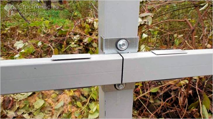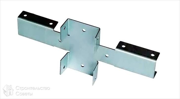 Существует технология, которая позволяет сделать каркас забора без сварки. Для этого используется Х-кронштейны. Представляет собой этот кронштейн крестообразную пластину, у которой края загнуты. Крепится она к столбам саморезами.