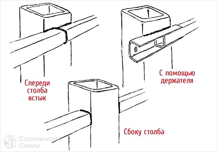 Металлические перемычки можно приварить к столбам опоры. Делать это следует между опорами или с наружной стороны. Если приваривать поперечины между опорами, то необходимо нарезать трубы на соответствующие куски. Хотя этот метод требует больших усилий, каркас забора получится очень жестким. Каждый столб забора будет выполнять роль опоры для листов. Значительно работы меньше, если трубы сваривать снаружи. Но при этом также будут обрезки, так как каждый стык труб должен приходиться на столб опоры.