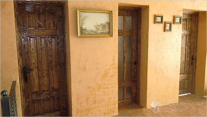 Эффекта старения можно добиться путем заполнения специальным щелочным грунтом древесных пор обрабатываемой двери с использованием кисточки или губки. Это необходимо сделать для фиксации цвета на деревянной поверхности двери. По окончании данной процедуры деревянная поверхность изделия натирается античным воском, для этого необходимо использовать только специальные металлические щетки. В итоге получается необходимая фактура и желаемый эффект старины.