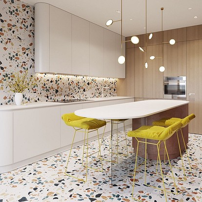 Столешницы Terrazzo яркие и функциональные. На крапчатых поверхностях загрязнения не так заметны.