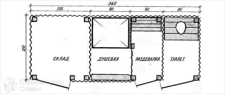 - Имеет не только санузел, но и место для отдыха – небольшую комнату с мягкой мебелью или крытую веранду.