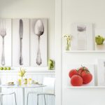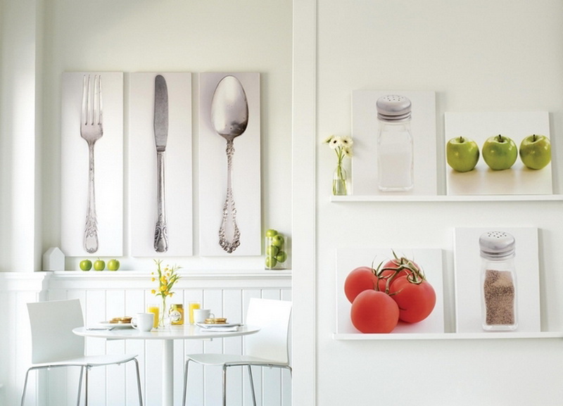 Если вы освободили место для готовки и обошлись без верхних шкафов, заполните пустующее место картинами. Так вы не только покажете наличие вкуса гостям, но и с помощью визуально искусства сможете воздействовать на друзей возбуждением аппетита.