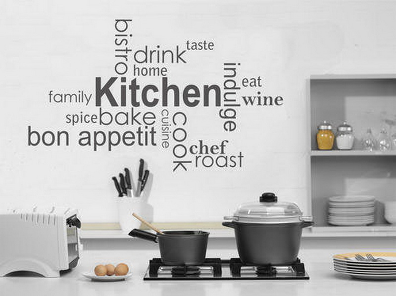 Декор стены на кухне может быть абсолютно разным. Если вы не любите визуальный тип интерьера, тогда обратитесь к лингвистическому. Пусть ваши стены говорят сами! Надписи могут общаться с гостями и говорить о хозяйке лучше, чем любой стиль.