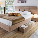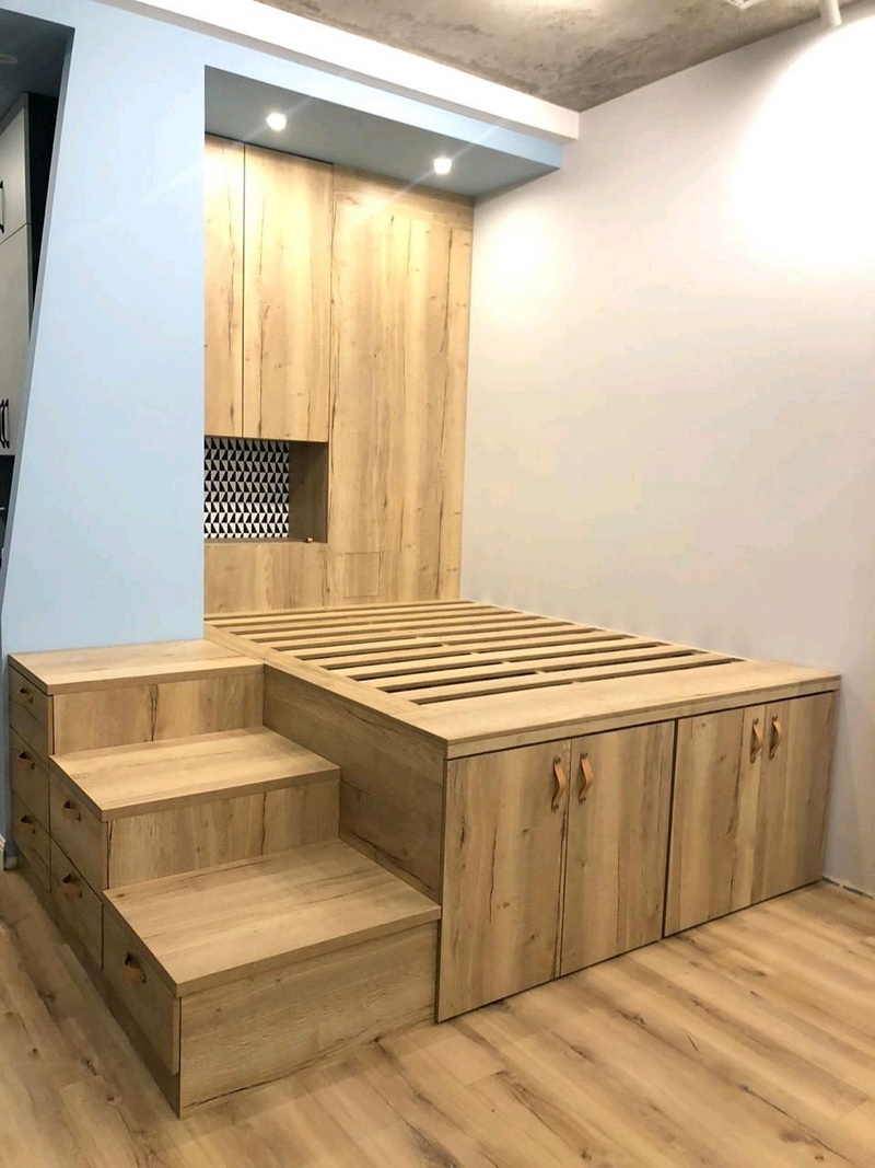 В кровати такого вида не вмонтировать ящики под белье. Главное правило при сборке-опору кровати не должно быть видно при входе в комнату. Также опору можно выполнить из материала с зеркальной поверхностью.