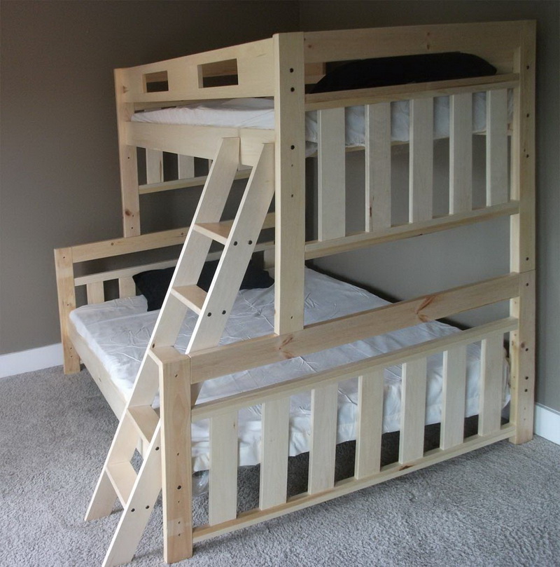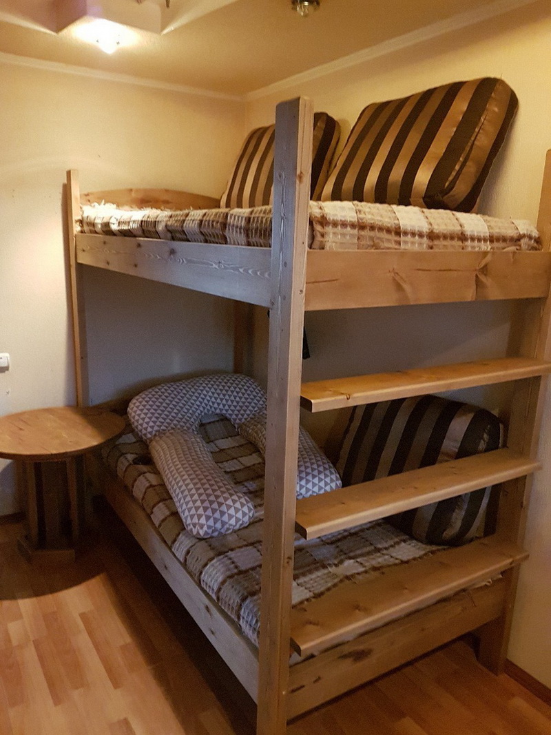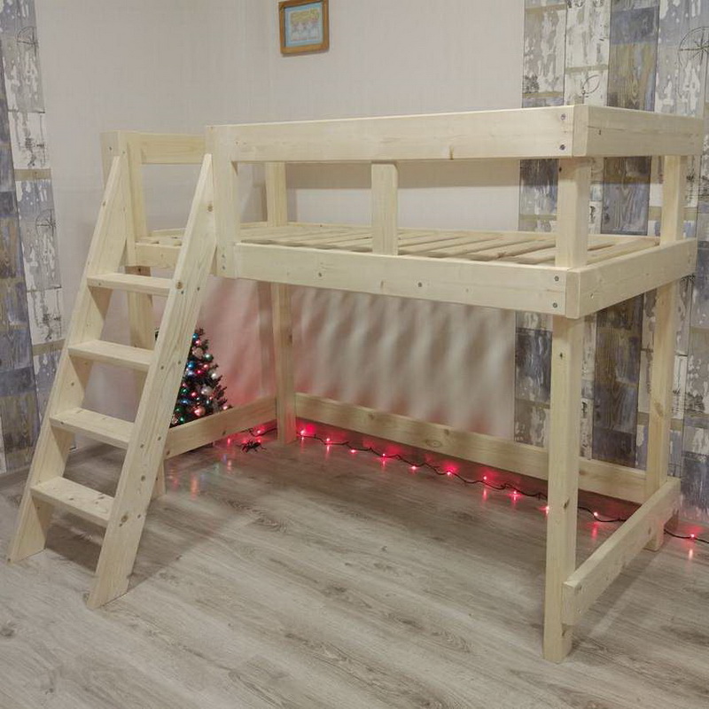 Собирая каркас этой модели ориентируйтесь на размеры детского матраса и увеличивающийся с возрастом вес ребенка, боковые верхние бруски должны легко выдерживать висящего на них дитя. Бруски размером 45*45 подойдут для сборки. Предварительное просверливание отверстий для саморезов так же положительно скажется на качестве эксплуатации дерева.