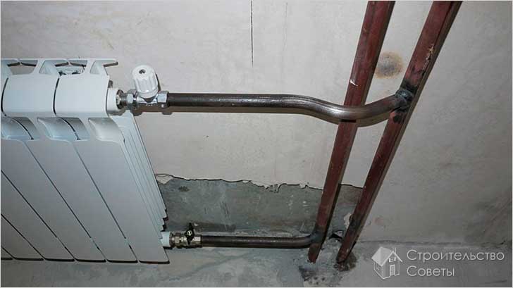 - Если от стояка до радиатора (или другого прибора отопления) более 50 см, то отвод делается с обязательным уклоном в сторону батареи. Если расстояние меньше полуметра, то уклон делать необязательно.