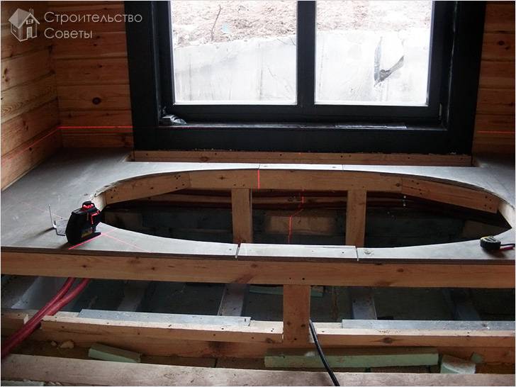 После того как каркас полностью смонтирован, можно приступить к непосредственной установке ванны. Этот этап не менее важен. В отведенном месте для чаши необходимо залить цементную подушку, чтобы дно было максимально зафиксированным.
