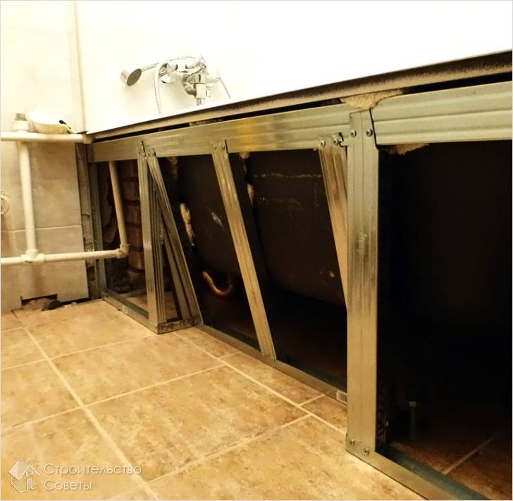 - Металлический профиль. Легкий профиль достаточно просто монтируется, поэтому нет необходимости в привлечении специалистов. Если масса ванны, объем воды и вес человека небольшие, то использование алюминиевого профиля будет допустимо, в противном же случае стоит рассмотреть другие варианты.