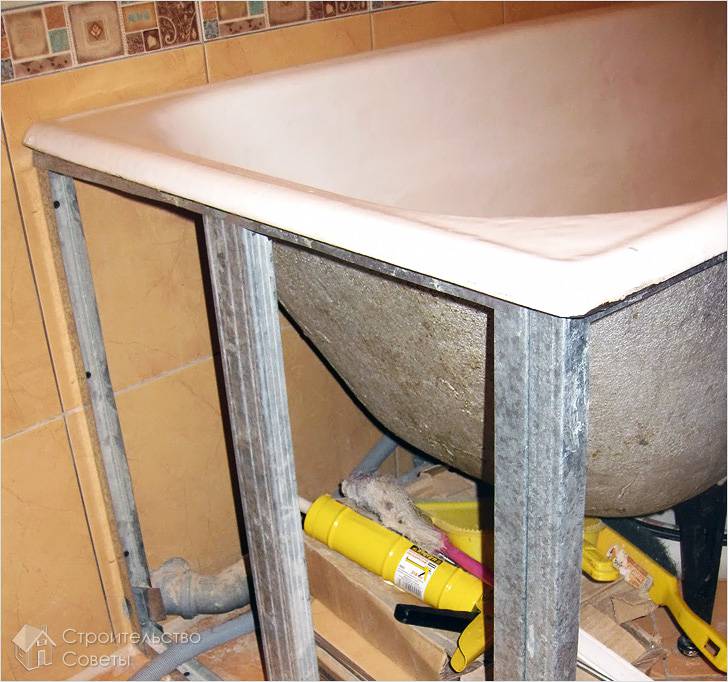 На подготовленное напольное основание устанавливают вертикальные опоры, которые должны располагаться на одинаковом расстоянии друг от друга. Верхняя часть конструкции также должна установиться четко горизонтально, чтобы борта на чаше ванной хорошо зафиксировались. На последнем этапе выполняется обшивка, для которой могут использоваться различные отделочные материалы.