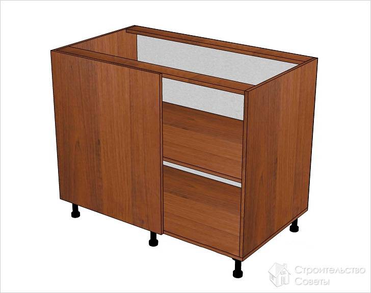 Сама тумба может быть изготовлена двумя способами. Первый предусматривает отсутствие ножек. В этом случае можно не делать каркас. Боковины из листа ДСП (толщиной 18–20 мм) соединяются вместе. При этом верху и внизу боковины соединяются встык конфирматами или при помощи мебельных уголков и саморезов по дереву.