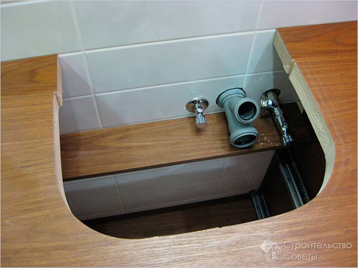 Самый простой вариант – это изготовление прямоугольной тумбы. Для этого, при помощи электролобзика, в будущей столешнице прорезается отверстие по форме раковины. При этом с одной боковины и спереди необходимо оставить 5–10 см края столешницы. С другого бока (как правило, справа) можно оставить больше пространства, если тумба будет установлена на кухне.