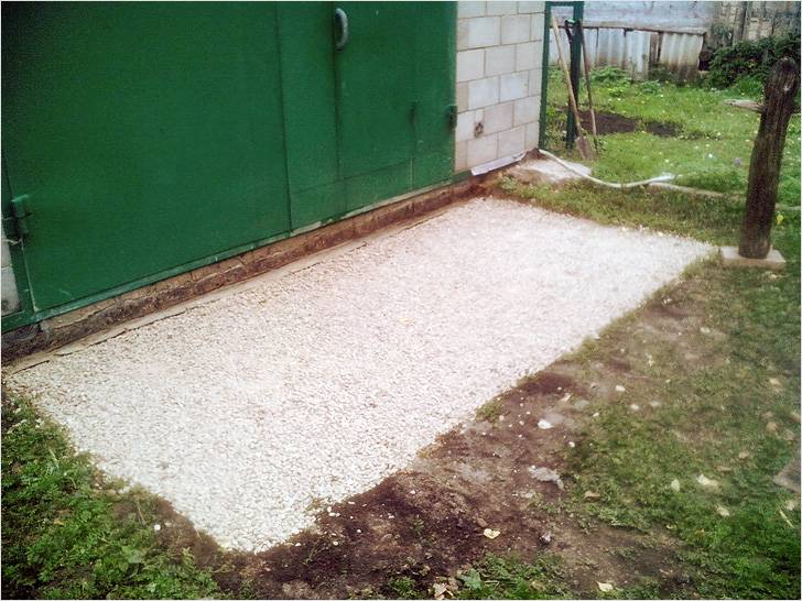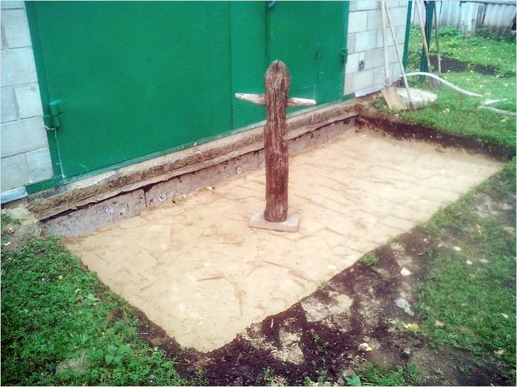 На площадке перед воротами вынимаем грунт на глубину 35–40 см. Ширина должна превышать ширину ворот, как видно на фото. |