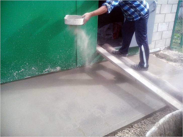 Когда стяжка немного отстоится, ее посыпают сверху сухим бетоном. Это увеличит ее гидроизоляционные свойства. |