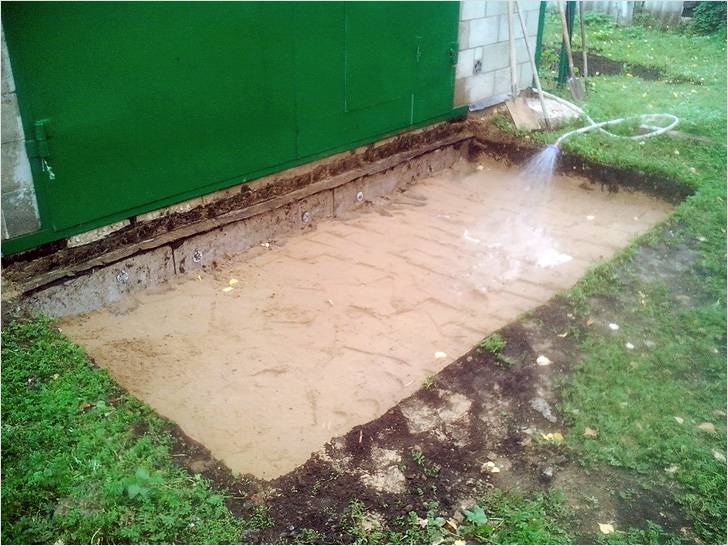 - Создают подушку из песка толщиной 5–6 см, которую проливают водой, чтобы песок заполнил все щели и утрамбовался.