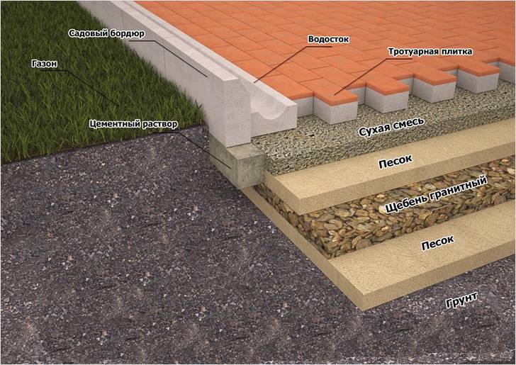 - Финишное покрытие выполняют из бетона, тротуарной плитки или выбирают другие уместные варианты. Как это сделать, было описано выше.