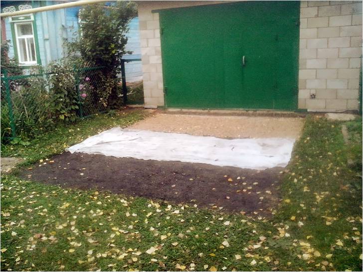Решено расширить благоустроенную площадку перед гаражом за счет щебенки. Предварительно снимают растительный слой и расстилают геотекстиль, чтобы щебенка со временем не перемешалась с землей. |