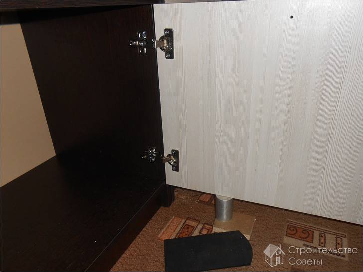Ставим дверки на шкаф, на шарнирные петли: сначала верхнюю петлю, потом нижнюю. Для удобства можно подставить подпорку под дверку, чтобы не сползала. Затем прикрепляем две средние петли.