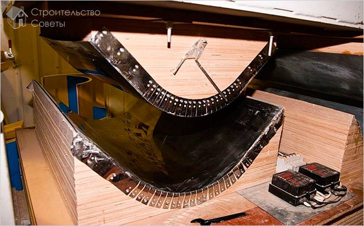 Перед сгибанием фанеры методом склеивания первым делом изготавливается выкройка. Затем пластину фанеры прогибают точно по этому шаблону, сверху наносят клей и кладут следующий слой материала. Нужно следить, чтобы направления шпона пластин фанеры чередовались. Все слои материала нужно зафиксировать между собой на 20‒25 часов струбцинами. Когда готовая деталь полностью просохнет, ее нужно тщательно отшлифовать, чтобы убрать неровности поверхности и излишки клеевой смеси.