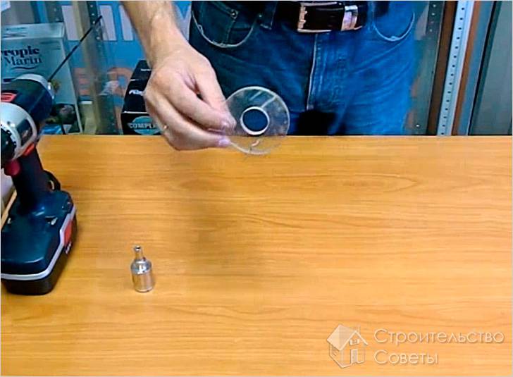 Перед сверлением стеклянной детали необходимо изготовить своеобразный шаблон. Для этого необходимо в небольшом кусочке стекла просверлить отверстие. Дело в том, что даже если используется специальное сверло, начинать сверление достаточно сложно. Сверло будет обязательно смещаться и царапать поверхность, потому и нужен шаблон. Для его изготовления, небольшой кусочек стекла нужно положить на столешницу и прижать к ней с помощью струбцины. Как между стеклом и столешницей, так и между стеклом и струбциной необходимо проложить слой картона, во избежание возникновения трещин. Затем поверхность смачивается водой и можно начинать сверление. Дрель нужно устанавливать на средние обороты. Процесс сверления будет протекать медленно и происходить нагревание поверхности, а потому сверло нужно периодически охлаждать. Когда отверстие будет готово, можно переходить к дальнейшим этапам работы. - Изготовленный шаблон укладывается в месте предполагаемого сверления и закрепляется при помощи скотча или малярной ленты.