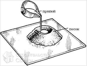 Ну и в качестве совсем уж экзотического способа выполнения отверстий в стекле можно упомянуть следующий процесс. В месте предполагаемого отверстия нужно насыпать немного мелкого и чистого песка. Затем, с помощью заточенной деревянной палочки или карандаша необходимо выполнить в песке воронку, равную по диаметру предполагаемому отверстию. Здесь важно следить за тем, чтобы на поверхности стекла внутри воронки не было песчинок. Затем в эту воронку заливается расплавленное олово или свинец и всё оставляется до остывания. После чего, песок нужно убрать, а застывшее олово удаляется с помощью пассатижей. Из-за высокой температуры стекло приплавляется к залитому припою в результате получается достаточно ровное отверстие.