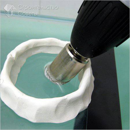 - Далее, отверстие в шаблоне заполняется водой и начинается сверление. Торопиться не стоит. Сверлить нужно на чуть ниже средних оборотах сверла. Все эти действия нужны для того, чтобы место входа сверла не получило излишнюю нагрузку и не образовались сколы.