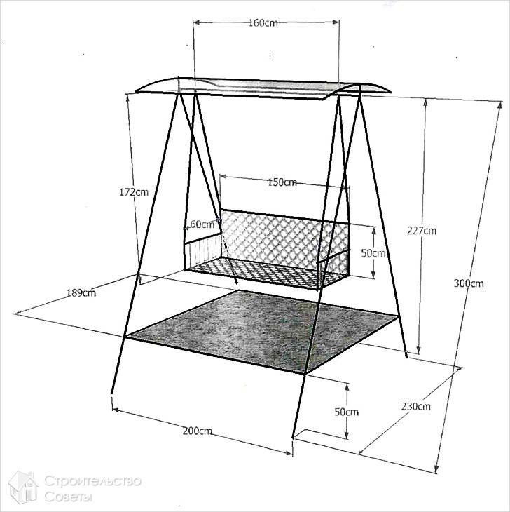 Размер люльки может быть разный одноместный или двухместный. Также на балке может быть несколько люлек, но в таком случае вам необходимо будет изготовить несколько тоннелей для большей прочности на самой балке. Что касается качелей для дачи, то в большинстве случаев на балку подвешивается диван или одноместная люлька. Каркас следует сделать полностью из металла. Для этого можно использовать уголок или швеллер.