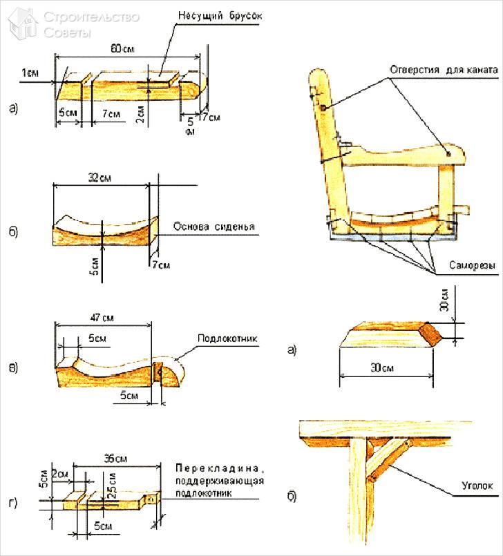 - Также стоит позаботиться об изготовлении подлокотников. Для этого можно использовать брус любой ширины. Один конец бруска крепите к раме спинке, а другой к сиденью.