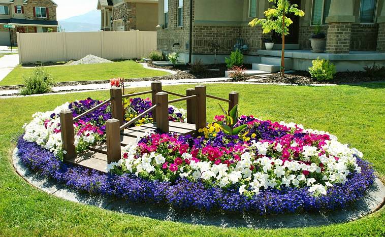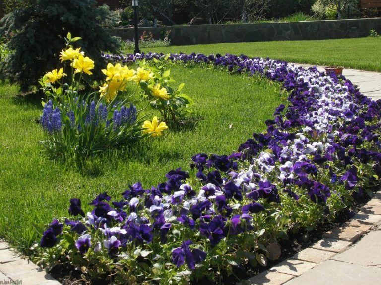 - Если ландшафтный цветник, будет расположен на газоне, то не нужно его обрамлять забором, достаточно просто посадить низкорослые однолетники.