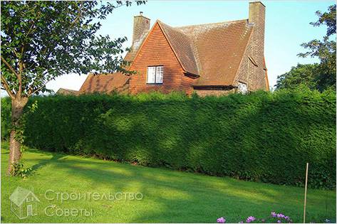 Высадка живой изгороди из низкорослых деревьев или вечнозеленых кустов при входе на участок является сегодня самым популярным и модным видом ландшафтного зонирования. К такому «зеленому» ограждению отлично подходит изящный забор из штакетника, выкрашенный в чисто белый цвет. Изысканно также будут смотреться конструкции из тоненьких металлических прутьев, тонированных серебряной или золотой краской. Такие изделия придают участку самобытности и эксклюзивности, прозрачности и легкости.