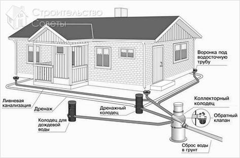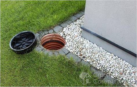 От верхней до нижней точки водоотводящей системы устанавливаются только ревизионные колодцы. Вода, собранная дренами, поступает в коллекторный колодец. На участке выбирается самое низкое место, и там, в точке сброса воды, должен быть установлен коллектор. Он соединяется с последним смотровым колодцем гибкой трубой; он оснащается дренажным насосом и диаметром должен быть не менее 600 см.