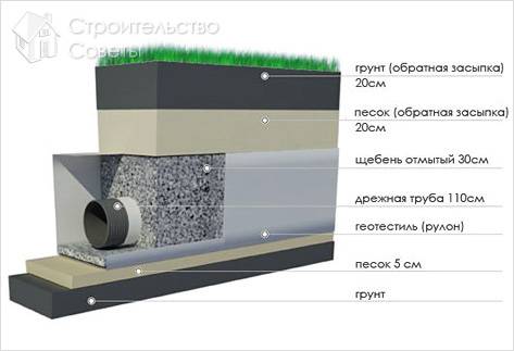 Дрены укладываются небольшими отрезками: устройство закрытого дренажа дома с помощью труб именно в таком виде позволяет выдерживать нужный уклон (0,5 — 0,7 мм), избегая провалов системы. Жёсткость труб способствует сохранению их положения во время подвижек грунта. Когда вся система смонтирована, дрены засыпаются гранитной мелкой фракцией 5 — 20 со всех сторон слоем в 30 см, после чего покрываются геотекстилем. На это покрытие насыпается песок до самого верха траншеи. Потом всё закрывается землёй обратной засыпки без камней и мусора.